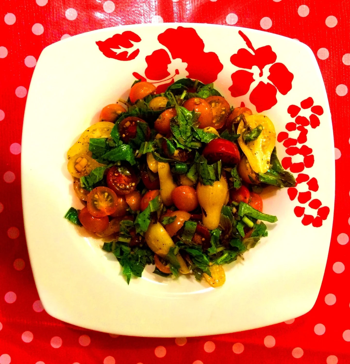 One of my favorite ways to enjoy cherry tomatoes is to use them in this easy salad.  It celebrates the perfection of the heirloom cherry tomato with minimal ingredients to weight them down.  Think of it as a bread-less bruschetta.  The only real difference between my salad and a tomato bruschetta topping is the bitter dandelion greens I add to balance out the sweetness of the tomatoes.  Or you can almost think of it as a variation of my spicy cherry salad, minus the spice.