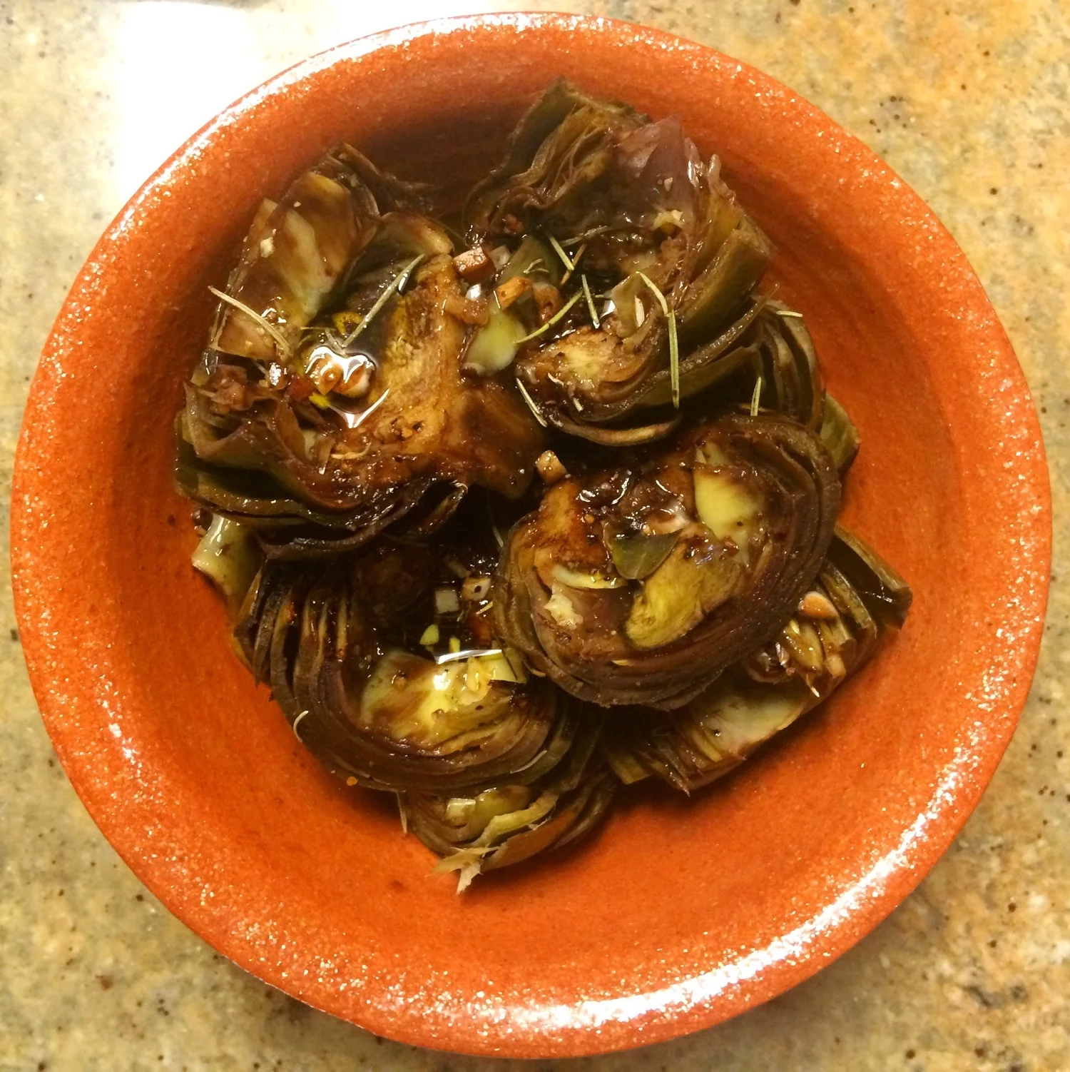 An easy way to trim artichokes is to simply slice 1-2 inches off the top of the artichoke.  This will take care of most of the thorny parts.  Then, using scissors, clip any of the remaining thorns.  You'll notice I used smaller artichokes for this recipe--not quite the super tiny ones, but the size of a tennis ball.  You can feel free to adapt this recipe for a larger artichoke or several extra-small ones, just make sure to adjust the boiling time accordingly (the bigger the artichoke, the longer the boiling time).  The marinade quantity stays the same.