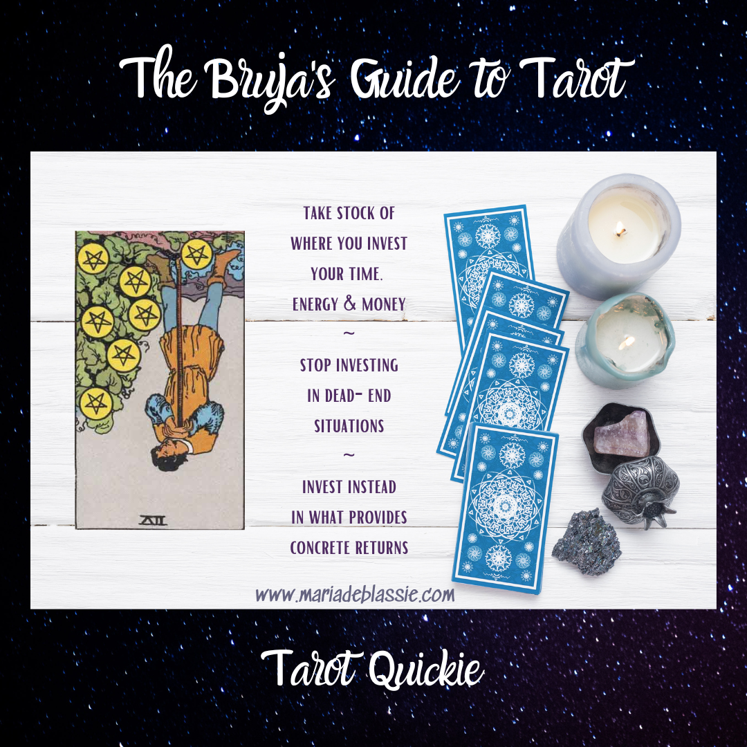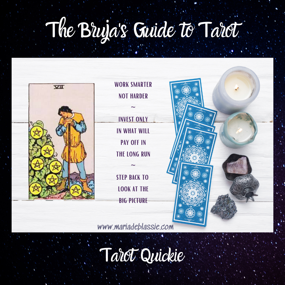 Reversed, the Seven of Pentacles is pointing to some sort of leak—energetically or monetarily. Take careful stock of where you are investing your time, energy, and money. Where are you losing valuable resources? Where is your investment paying off? You have to stop the leak if you want to rebuild your proverbial pile of coins.