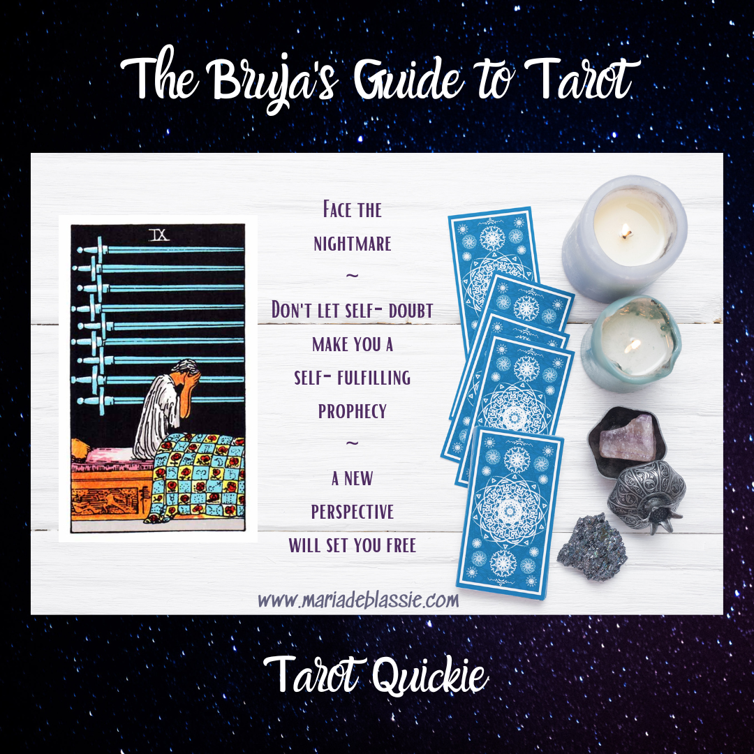 The Nine of Swords is one of those cards people dread getting. But this card isn’t the doom and gloom people think it is. It’s about facing your fears. The figure in the card sits upright in bed, as if awakening from a nightmare with a start. This is not a time to ignore the monster under the bed or the thing keeping you up at night.