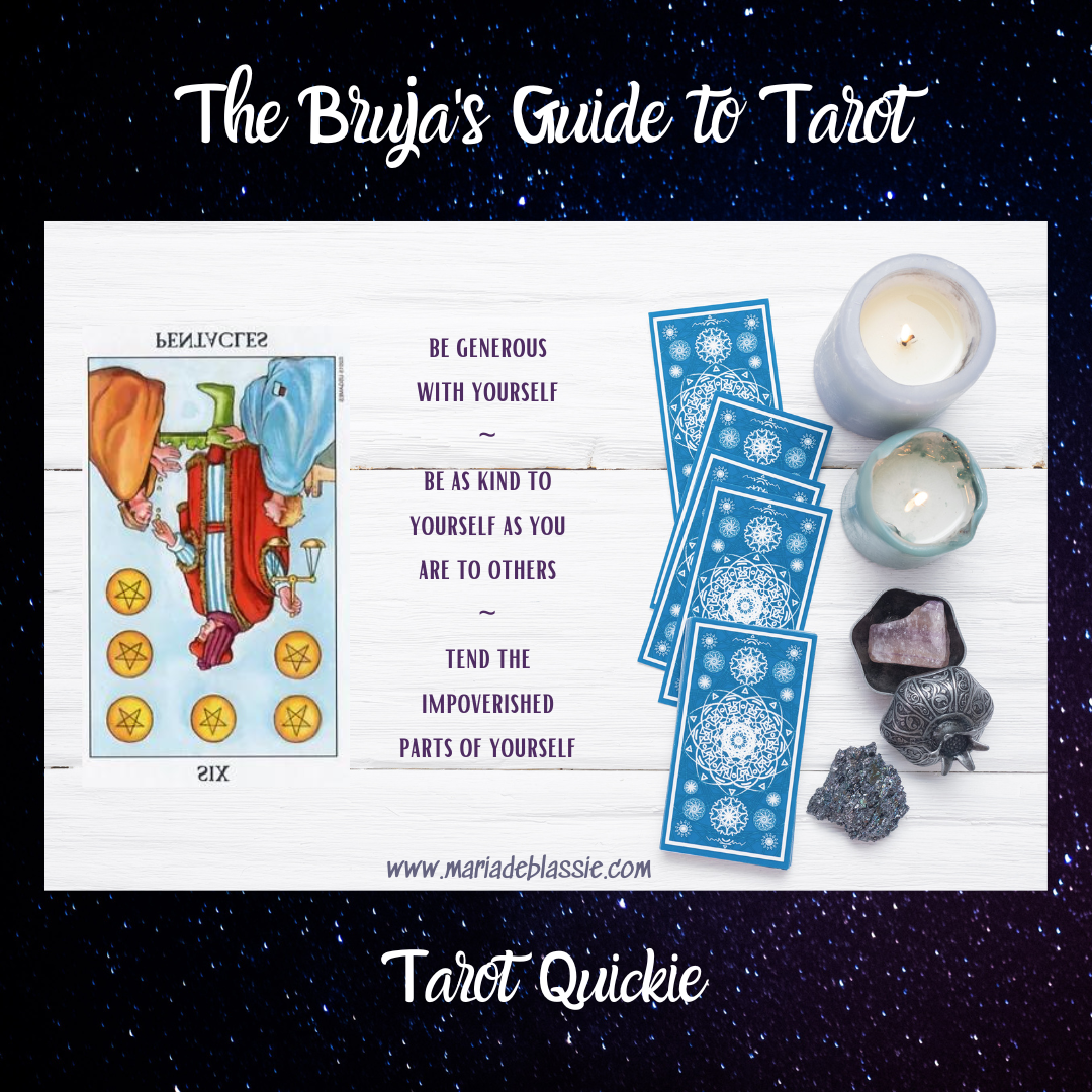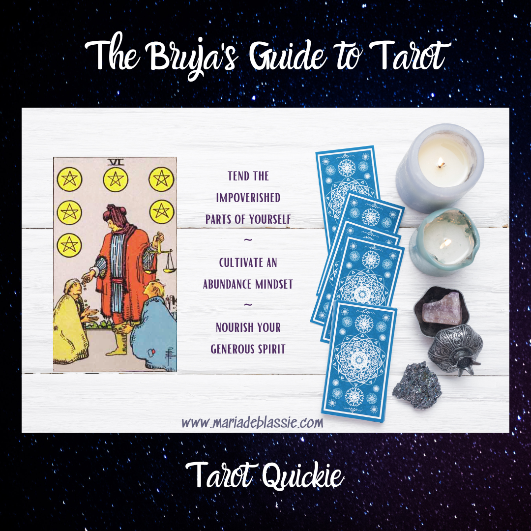 This is an interesting card, metaphysically, although I suppose I could say that about all the cards. The Six of Pentacles is about a generosity of spirit. What you give out comes back to you in one way or another. While the Two of Pentacles cautions against miserliness, this card celebrates that giving spirit.
