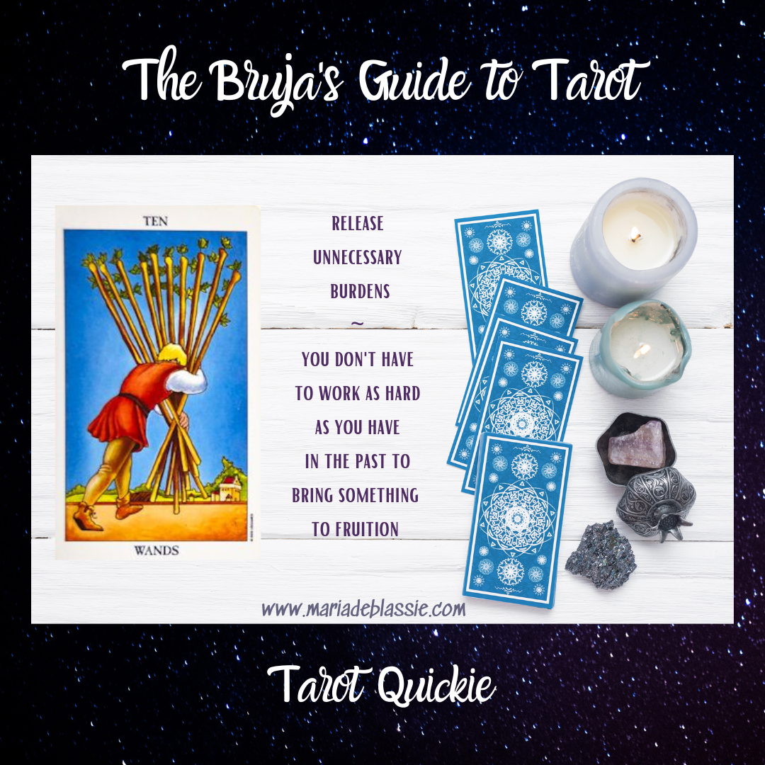 The Ten of Wands upright invites you to release unnecessary burdens. Often, we take on responsibilities and labor that aren’t ours to carry. This is especially true for those of us who are in caretaker roles or empathetic professions. We get used to carrying more than we should and normalize the oppressive weight of it. That’s terrible!