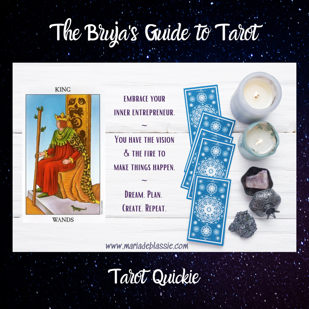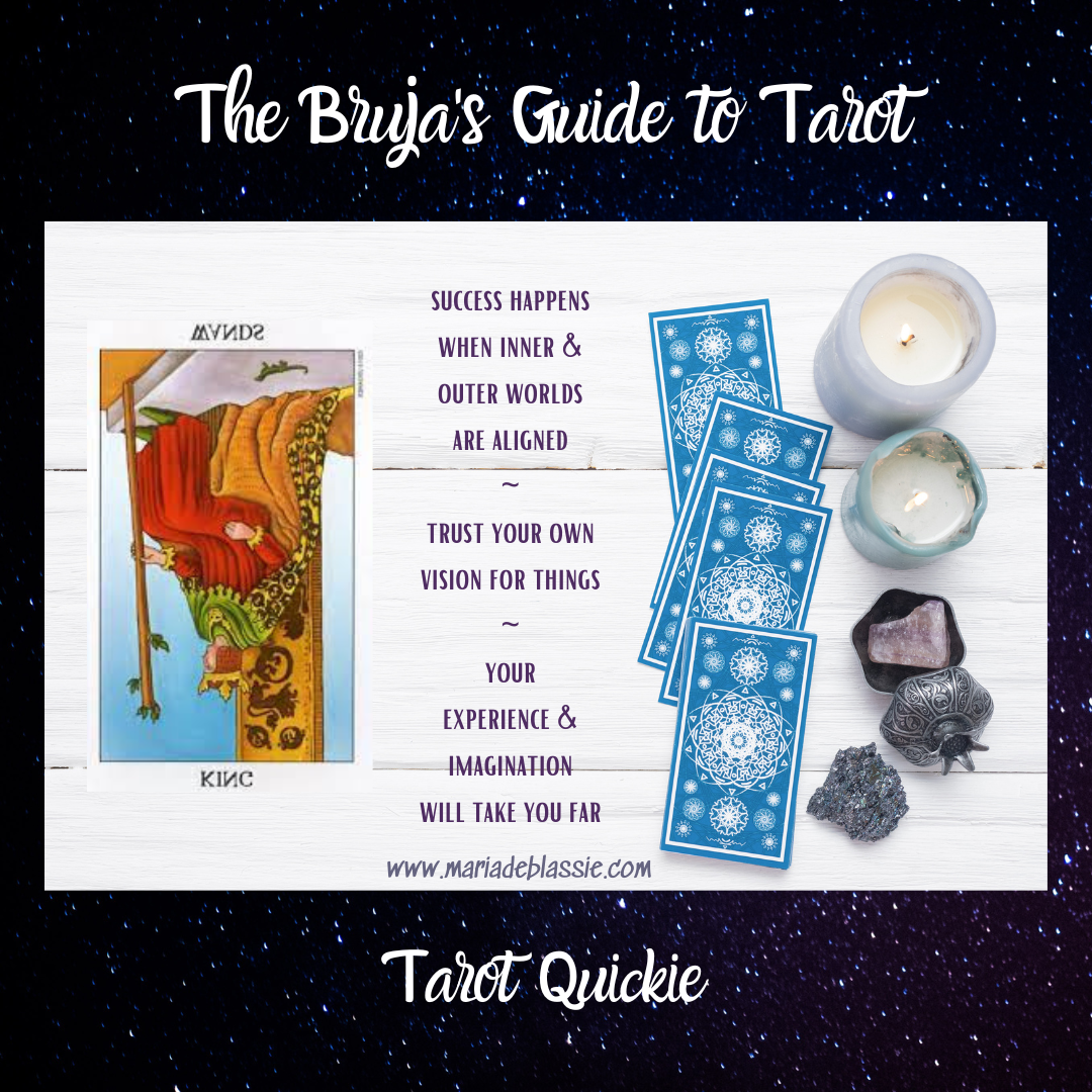 The King of Wands reversed is more focused on your internal life. This card serves as a reminder that success happens when inner and outer worlds align. If you’re blocked, focus on your emotional well-being and tending your psychic landscape until you’ve worked through what you’ve needed to (which, truly, is always an ongoing process). As you heal, notice how your external reality reflects that.