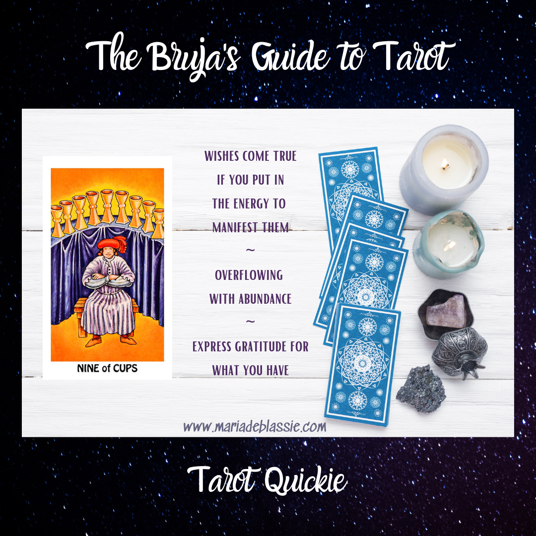 Unlike the Seven of Cups, which represents illusion and glamour, the Nine of Cups is about wishes coming true—if you put in the work. Here, a figure is seated and surrounded by nine upright cups. He is overflowing with abundance!